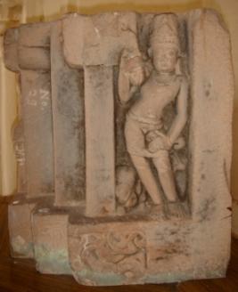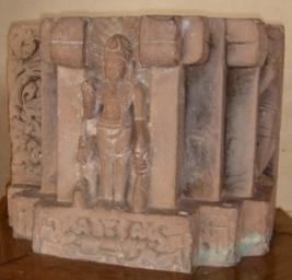 | Description / विवरण | Architectural fragment, part of a pillar depicting Indra in standing pose. He is holding ankush in right hand and left hand is in Kartavyalambit pose. He is wearing a Kirti mukuta and adorned with jewels. His vahan elephant is seen behind his legs. So the right of it Agni is depicted. He is holding a rosary in his right hand and a kamandal in his left hand. His vehicle ram is seen behind his legs. On the pedestal a Kirtimukha is seen. In the extreme right architectural designs are seen. |