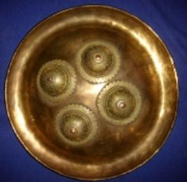 | Description / विवरण | Small circular brass shield with four bobs having incised flower designs. The backside has four rings to hold the shield. |