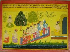 | Description / विवरण | Miniature painting based on Mahabharat - Vana parva depicting Markandeya rishi that informing Pandavas and Krishna about Jamento who is doing meditation for Swaraglok. |