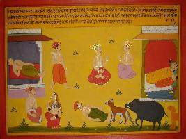 | Description / विवरण | Miniature painting based on Mahabharat - Vana parva depicting sage Markandeya preaching Yudhisthir that the person who come to earth and doing dharma moves to Devlok and will get rebirth in a good clan. Later the man will get wealth and all happiness. The man who dies in performing dharma will get nirvana. |