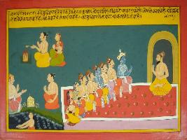 | Description / विवरण | Miniature painting based on Mahabharat - Vana parva depicting sage Markandeya is telling Yudhisthir that the person who perform Dharma will get wealth and the person who perform yagna and take holy dip in river will go to the heaven. The other Pandavas and Krishna is also seen with Yudhisthir. |