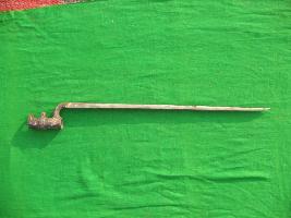 | Description / विवरण | It is an Italian Baynot. It has triangular shape blade. All three edge of the blade is sharp and tip is pointed. It has a cylindrical hook with screw. |