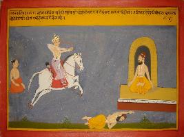| Description / विवरण | Miniature painting based on Mahabharat - Vana parva. It depicts sage Markandeya is telling the story of the prince of Hehaya kingdom to Yudhisthir. He said that while the prince going out for deer hunting he killed a sage, who was sitting on a deer skin, by mistake. |