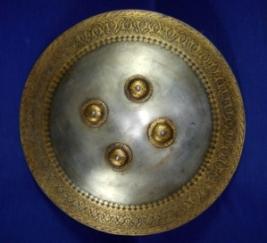 | Description / विवरण | Shield made of iron having golden work in the sides four bobs are fixed which also having some designs. In the reverse side a piece of velvet is fixing with it. Two cotton belt are there to handle. |