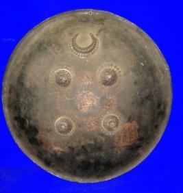 | Description / विवरण | Circular leather shield having four metallic floral phools bobs and a crescent moon. The inner part has padded holder. It is painted in black colour. |