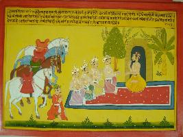 | Description / विवरण | Miniature painting based on Mahabharat - Vana parva depicting is shown talking to sage in his ashram. With king, his sons are also shown sitting. At the extreme right, their horses are left with one man taking care of them. |