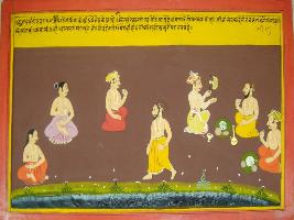 | Description / विवरण | Miniature painting based on Mahabharat - Vana parva depicting rishi Shaptri eating and one man is carrying a fan at the upper left part. Below this, another man is eating food. At the lower middle part rishi is depicted leaving. At the right part, two sages are shown meditating. |