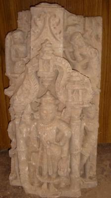 | Description / विवरण | Independent sculpture probably four armed Indra. His attributes from right below a missing b missing c resting on chest d holding a pitcher. He is wearing a varmala. On the either side two female chauri bearers are standing. On the upper both side two celestial figures are depicted. |