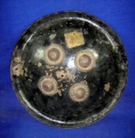 | Description / विवरण | Iron shield having four bobs phool on black colour base. The inner side is plain with a ring to use for handle. |