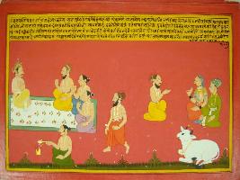 | Description / विवरण | Miniature painting based on Mahabharat - Vana parva depicting Markandeya rishi telling story of Raja Vaisp and Atri rishi to Yudhisthir. At the left Atri rishi is shown talking to his wife and son about going to king Vaisp s Ashwamegh yagna. At the middle he is shown leaving. At the lower right part, king is shown performing yagna. |