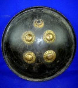 | Description / विवरण | Leather shield dhal having four brass bobs and moon on designed on the exterior side and in the interior one padded cloth in the centre fitted with iron. |