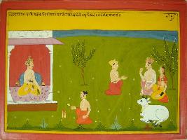 | Description / विवरण | Miniature painting based on Mahabharat - Vana parva depicting Raja Vaisp coming ro Atri rishi, praying and giving him cow in alms. |