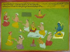 | Description / विवरण | Miniature painting based on Shri Bhagwat Gita. It is a depiction based on Gita. Here doing work without any desire for result is emphasized, peoples are depicted worshipping various god, performing yagna and obeying the master. |