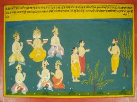 | Description / विवरण | Miniature painting based on Mahabharat - Vana parva. Where a sage asked to Sanat Kumar that the king who always look after his subject is comparable with Indra, Brahma and Raja Suka and the sage which is worshipped by that king is great. |