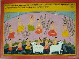| Description / विवरण | Miniature painting based on Mahabharat - Vana parva depicting Saraswati telling Narasya that he who gifts cow will get Uttam lok, he who gifts bull will go to Suryalok, he who gifts cloth will go to Chandralok and he who gifts gold will go to heaven. It depicts different kind of daan. |