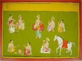 | Description / विवरण | Miniature painting based on Mahabharat - Vana parva depicting a king in several positions and also a child sacrifice. A yajna is seen in the lower part of the painting. |