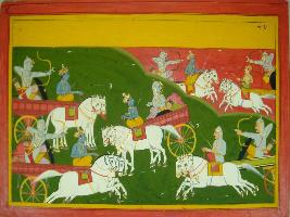 | Description / विवरण | Miniature painting based on Mahabharat - Vana parva, where a fighting seen of Arjun is depicted. |