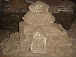| Description / विवरण | Sculptured architectural fragment of a Shikhar, depicting a male deity on seated position under a niche having amlak design carved upon it and both side carved architectural design. |