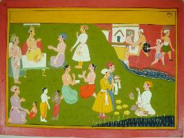 | Description / विवरण | Miniature painting based on Mahabharat - Vana parva. On one side a king is depicted sitting on throne and talking to a man, on the lower part peoples are depicted talking. One man is depicted selling something. On the other side some people depicted shaking hands and some fighting and one man carrying a bag on his head. |