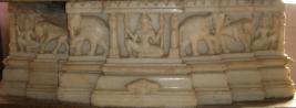 | Description / विवरण | Sculptured architectural fragment-pedestal of a Jain Tirathankara. It depicts a two armed deity in centre in pillared niche. She is flanked by elephant and lion on either side. The pedestal contains one line inscription dated V.S. 1679 and mention name of sculpture viz. Mohan. It was carved during reign of Mughal emperor Aurangzeb. |