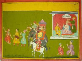 | Description / विवरण | Miniature painting based on Mahabharat - Vana parva. The painting depicts a royal procession where four princess who are in elephant back welcoming by musicians. While in the left side Raja Yudhisthir is sitting on throne and talking with a minister. |