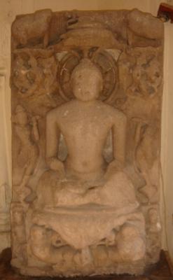 | Description / विवरण | An independent sculpture of Jain Tirathankara sitting in padmasana on high pedestal. His face is mutilated and arms below elbow and knees are chopped off. A partially broken canopy is seen on his head and a lotus designed nimbus is seen behind his head. Below the pedestal one mythical figure is seen in each side but its faces are chopped off. To its right a male figure in dancing pose is depicted and to its left a female figure in dancing pose is depicted. Above it in each side one deva figure is depicted in standing position but face and left leg of the left figure is chopped off. At the upper most part mutilated elephant is seen in each side, but mostly chopped off. Below it, near the nimbus garland bearers are seen in each side but figures are almost mutilated. |