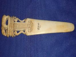 | Description / विवरण | Ivory knife with blunt edges and pointed at tip. Its handle is carved with an elephant at the top. Two peacocks are seen at both sides just on top of the blade. |