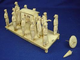 | Description / विवरण | Ivory palanquin carried by four men, 10 men are guarding the palanquin carrying spears and sticks. Inside palanquin a handicapped European man is sitting. Jali works an be seen at sides of flat base. The palanquin is fully decorated. |