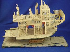 | Description / विवरण | Ivory ship, keeping on a wooden pedestal, with jali work design on the body. On the top of the ship birds like peacock, owl and pelican are made while a man is standing in one side. Beside it in the lower part of the ship, flora and fauna designs are carved. |
