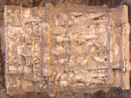 | Description / विवरण | Sculptured architectural fragment depicting four handed Lord Shiva in dancing pose in pillared niche.Attributes from right below-on the chest,khatbhang.His vahana nandi is depicting behind him.On his both sides two female dancers are seen .Faces of all of them are mutiliated. On top three celestial dancers are seen and in the bottom two lions are seen at their both sides of the niche. |