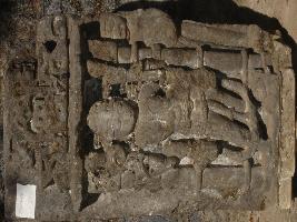 | Description / विवरण | Sculptured architectural fragment depicting probably four handed Varun in standing position in pillared niche. Attributes from right below i a rosary ii a pasha iii a mace, iv chopped off. He is wearing a karand mukuta and adorned with jewels. At the left of him a male attendant is depicted but his left part of body is chopped off and legs are almost mutilated. |