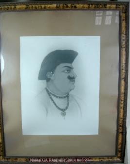 | Description / विवरण | Black and white photograph of Maharaja Randhir Singh 1805 to 23 A.D. The photograph is kept in a glass frame having decorated wooden border. |