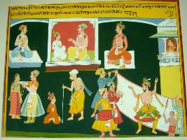 | Description / विवरण | Miniature painting based on Sarangatattva - an independent work of Sankhya school of philosophy. On the upper side four men and a child are depicted. In the lower side one man is depicted marrying a woman, people are depicted celebrating by dancing and playing musical instruments. |