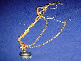 | Description / विवरण | Silver bor pendant having two circular knobs. The lasou is conical in shape, with floral designs, studded with red and green artificial stones. It has two chain supporters at both sides at the lower part. They have been kept together. |