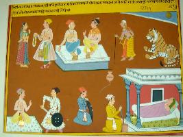 | Description / विवरण | Miniature painting based on Sarangatattva - an independent work of Sankhya school of philosophy. On the upper part a couple, two men talking and seated on a platform, an old woman walking and a seated tiger are depicted. In the lower side one man sitting on matress, a man pulling his sword out of the scabbard, one holding shield and one using mortar and pestel and a person sleeping are depicted. |