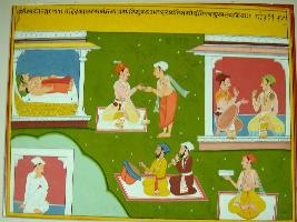 | Description / विवरण | Miniature painting based on Sarangatattva - an independent work of Sankhya school of philosophy. A man is depicted very sad as he has no son to succeed him, he gives alms and then a son borned to him. There is a scene of celebration also. |