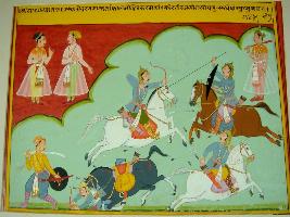 | Description / विवरण | Miniature painting based on Sarangatattva - an independent work of Sankhya school of philosophy. Two people are discussing about the harmful results of war and a scene of war is depicted in the right side. |