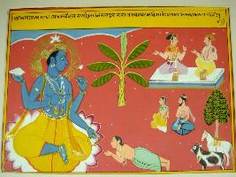 | Description / विवरण | Miniature painting based on Sarangatattva - an independent work of Sankhya school of philosophy depicting Lord Vishnu seated on a Lotus and a devotee paying homage. On right top side, two kings are sitting and talking. Below them, a female and a saint are sitting. |