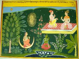 | Description / विवरण | Miniature painting based on Sarangatattva - an independent work of Sankhya school of philosophy. In the upper left part, two nobles are depicted, seated on mat. In the lower part, Chanda and Chandni are depicted by a female seated on crescent moon. A man is sitting on the ground in the middle part. |