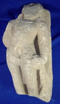 | Description / विवरण | Sculptured architectural fragment depicting a male attendant standing in Kartavyalambit pose. His face, right hand and feet are missing. The figure is rubbed off. |