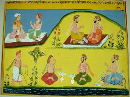 | Description / विवरण | Miniature painting based on Sarangatattva - an independent work of Sankhya school of philosophy. In the upper right part, two men are seated on mat and talking, while in left part, two sages are seated and talking with each other. In the lower part three sages are sitting and one is walking. |