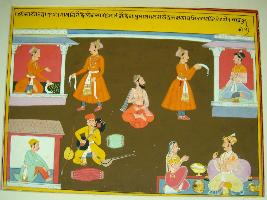 | Description / विवरण | Miniature painting based on Sarangatattva - an independent work of Sankhya school of philosophy depicting various scenes. A merchant is working in his house, collecting gold coins in a bag, giving it to a royal man. A musician is seated with his instruments. A king is seated with his wife and having food. |