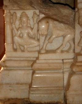| Description / विवरण | Architectural fragment of a two handed male deity in seated position holding a club in each hand. On his right a lion is seen whose upper body is partly chopped off. |