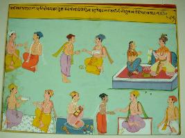 | Description / विवरण | Miniature painting based on Sarangatattva - an independent work of Sankhya school of philosophy depicting two men talking, a person giving gold coins to other, a royal man talking to his wife seated on couch. In the lower part, two men are talking, a man is standing, a man giving alms to the poor. |