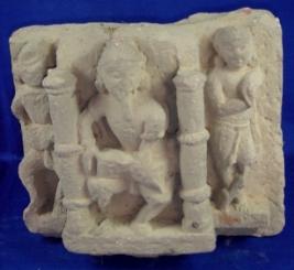 | Description / विवरण | Architectural fragment depicting a male drummer, playing drum in pillared niche. He is having beard and flanked by two males on either side of the niche. |