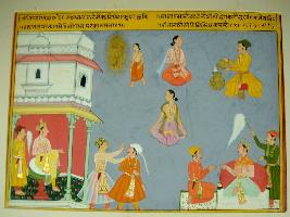 | Description / विवरण | Miniature painting based on Sarangatattva - an independent work of Sankhya school of philosophy depicting a king sitting on throne with a male chauribearer. In the upper part, four men are seen. |