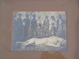 | Description / विवरण | This is a photograph of H.H. Ganga Singh ji. In this photo, H.H. Ganga Singh ji is standing with group and dead lion is lying. |