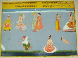 | Description / विवरण | Miniature painting based on Sarangatattva - an independent work of Sankhya school of philosophy depicting a man with bow and arrow and shooting at a target in lower right, to his left a sadhu is sitting in yoga position. At the upper left, a woman is talking to sadhu about her dead son. To their right, two men are talking to each other. At the upper right two men are dancing and playing instrument. |