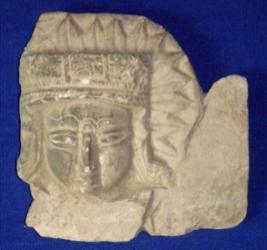 | Description / विवरण | Plaque carved with male head. He has elaborate head gear, hair ornaments and prominent facial features. Rest of the body is missing. |