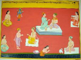 | Description / विवरण | Miniature painting based on Sarangatattva - an independent work of Sankhya school of philosophy depicting two men talking to each other at the middle. At the lower left a man is shown killing a swan, to his right a man is taking a bath, to his further right a man is giving some coin to another and at the upper right, a man is praying Lord Vishnu. At the upper left and lower right a man is shown seated with a leaflet. |